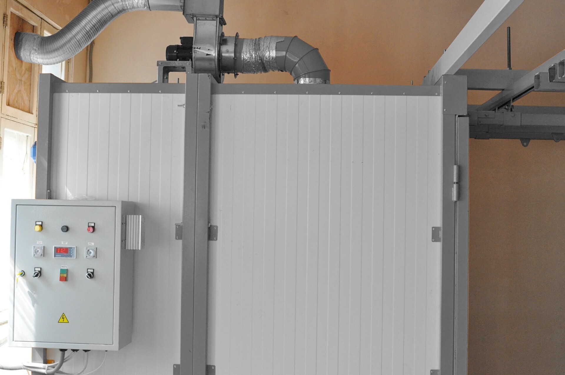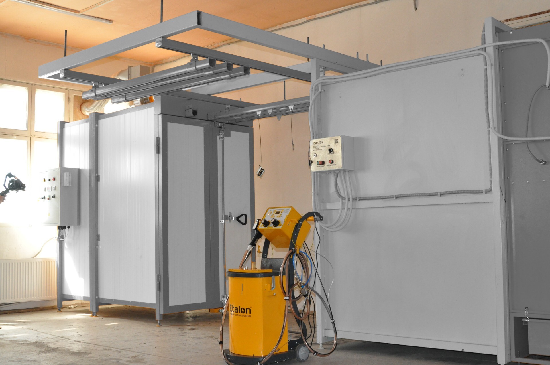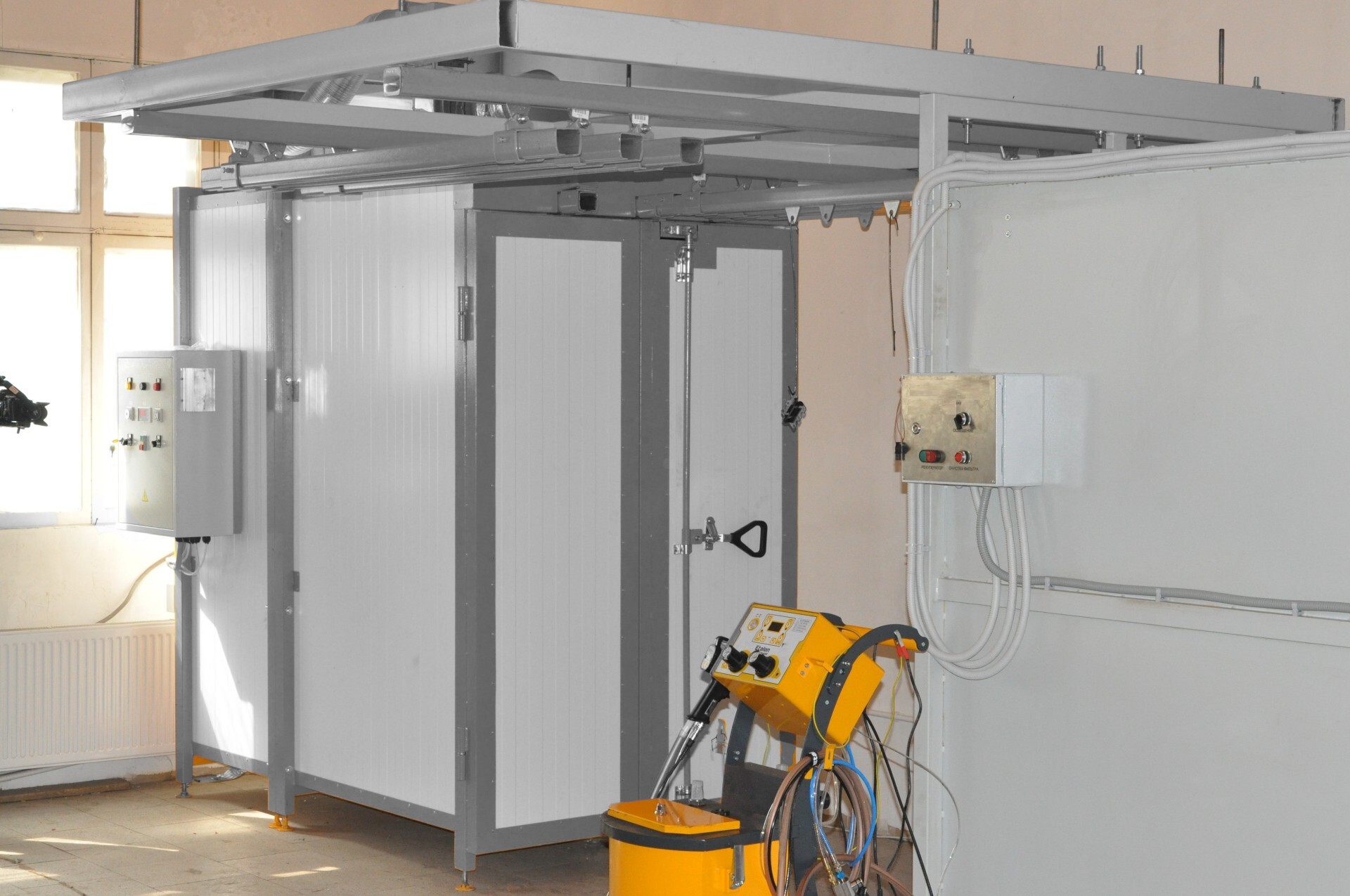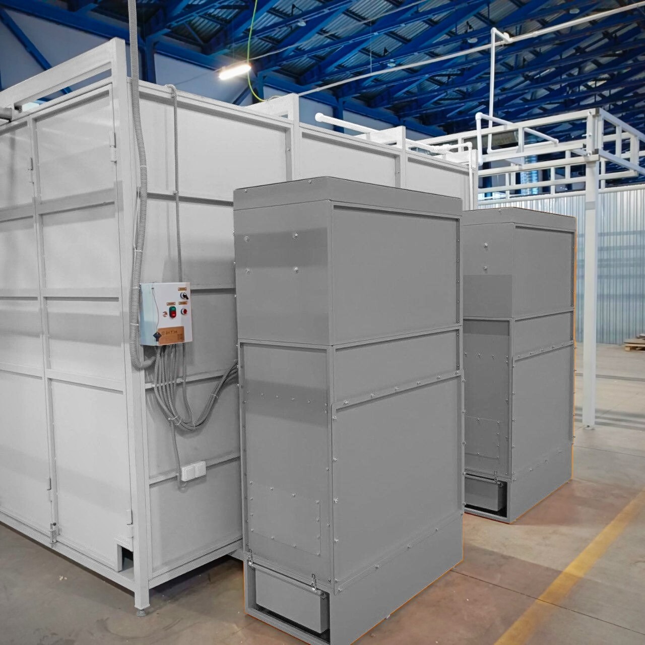 Камера нанесения порошковых покрытий обитаемая, объем (ДхШхВ) 3700х2400х2000 мм, проходная. Распределительный электроблок. Комплект розеток и выключателей.