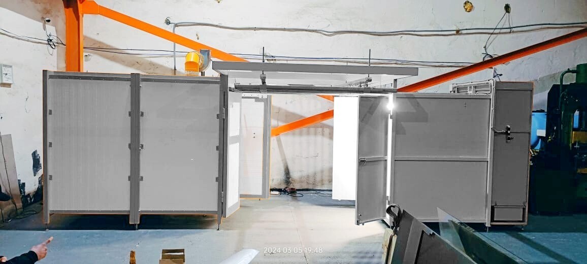 Камера нанесения порошковых покрытий обитаемая однопостовая, объем (ДхШхВ) 1450х1240х1800 мм, тупиковая. Две точки освещения.